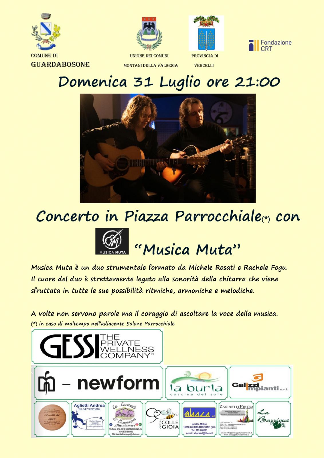 Appuntamento d'eccezione dell'estate in piazza di Guardabosone: il duo di chitarre acustiche "Musica Muta" di Perugia, si esibirà in concerto Domenica 31 Luglio alle ore 21:00 nella piazza Parrocchiale (Chiesa di Sant'Agata).