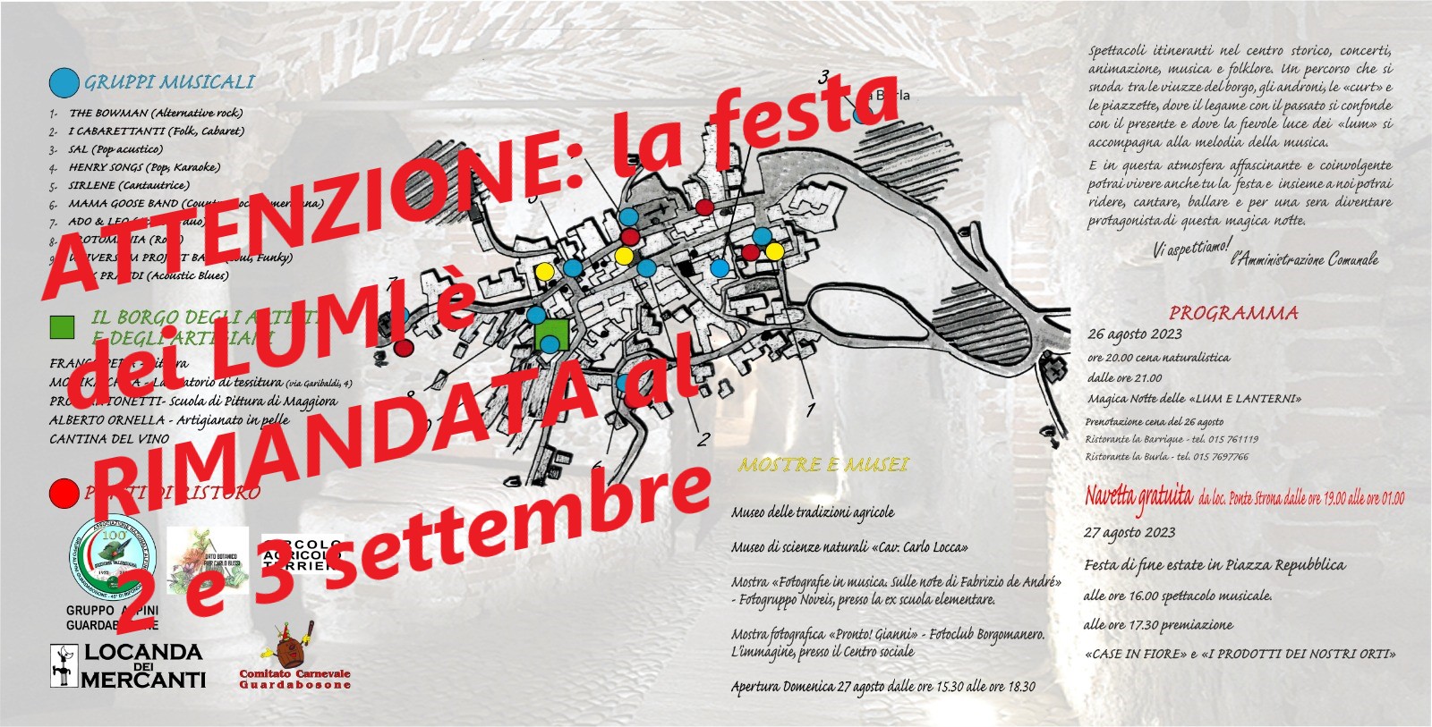 A causa delle previsioni meteo sfavorevoli la festa dei Lumi del 26 Agosto è rinviata al 2 Settembre e la festa di fine estate del 27 Agosto è rinviata al 3 Settembre.