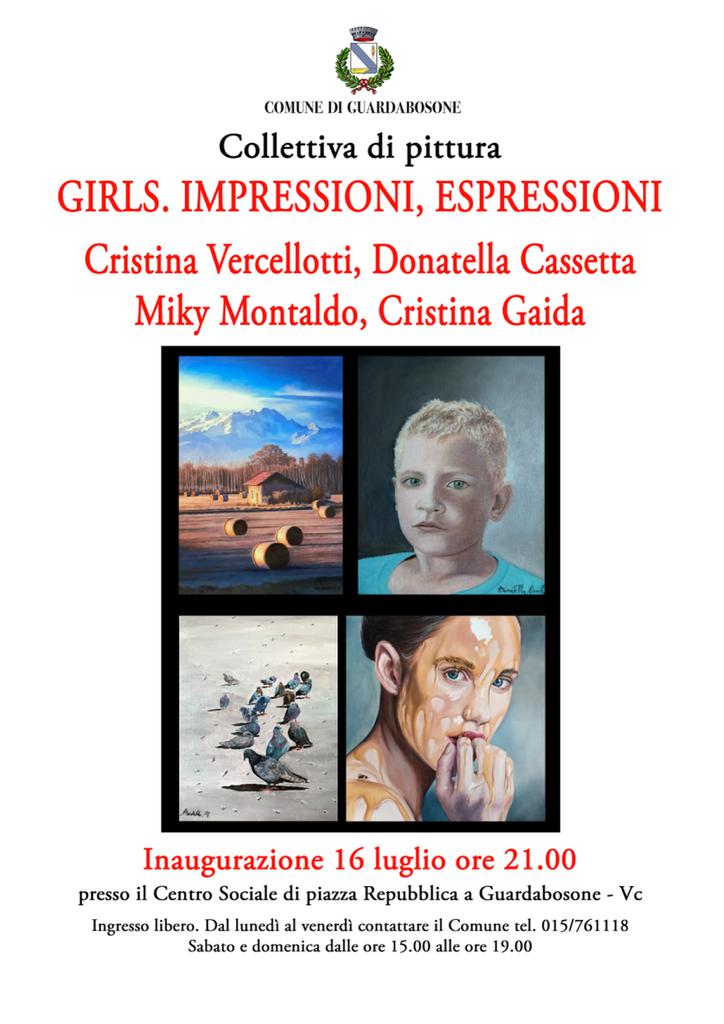 Sabato 16 luglio alle ore 21:00, presso il centro sociale di piazza Repubblica a Guardabosone sarà inaugurata la mostra collettiva di pittura di: Donatella Cassetta, Cristina Gaida, Miky Montaldo, Cristina Vercellotti.