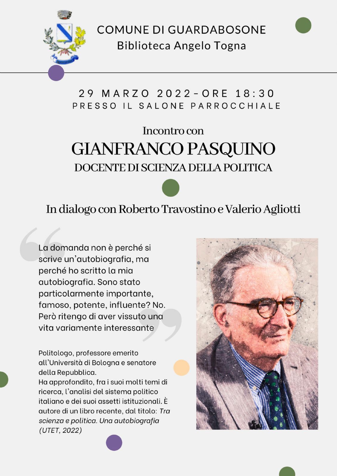 Il noto politologo Gianfranco Pasquino martedì 29 marzo alle ore 18:30 presso il salone parrocchiale di Guardabosone ci renderà partecipi della sua esperienza e della sua vastissima conoscenza delle istituzioni e del mondo politico italiano. Un appuntamento prezioso e da non perdere.