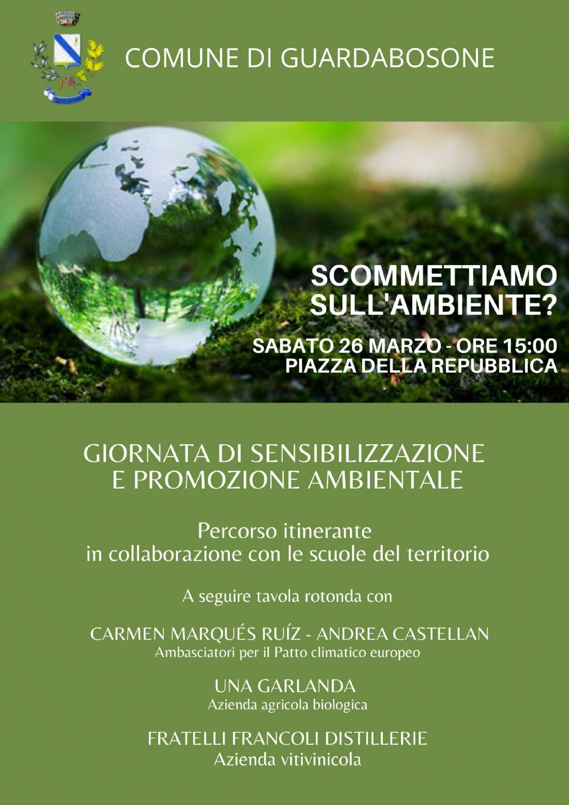 Ritrovo a piazza della Repubblica, sabato 26 marzo, alle ore 15:00 con percorso itinerante e, al termine, tavola rotonda con gli ambasciatori del patto climatico europeo, e con la presenza di alcune aziende agricole del nostro territorio.